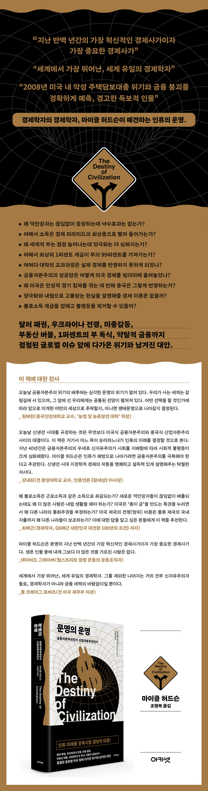 마이클 허드슨의 <문명의 운명>은 신자유주의 이데올로기가 지배하는 사회에서 금융자본주의가 경제적 양극화를 악화시키고 빈곤과 불평등, 환경 파괴를 초래한다는 주장을 담고 있는 책이다. 신자유주의의 ‘자유시장’과 ‘자유무역’이 소수의 지대 수취자에게 부과 권력을 집중시키고 이로 인해 경제적 양극화가 확산되고 있다고 주장하면서 세제 개혁과 공공 정책 개혁, 그리고 독점기업의 지대 추구 제한 등을 통해 지대 추구 경제를 탈피하고자 하는 대안을 모색한다.