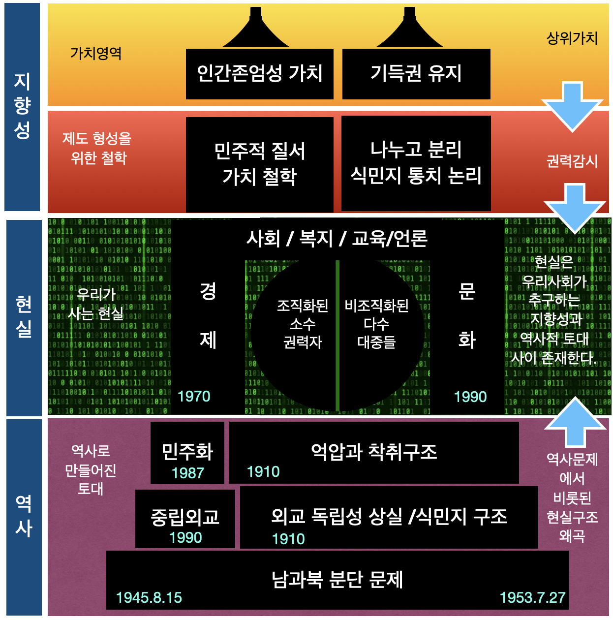 구조도를 보면 크게 우리가 앞으로의 삶을 결정하는 것은 우리의 지향점이다. 지향점에 따라 우리 현실은 달라진다. 그리고, 과거 역사의 토대에서 이뤄진 잘못된 구조를 알아야 현재 우리 사회의 개혁지점을 찾게 되고 수리를 하게 된다. 때로는 근본적 해결을 위해 큰 공사를 해야 할 수도 있다는 것을 말해준다.